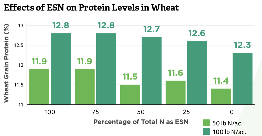 A four year Minnesota study demonstrates how ESN can increase protien levels in spring wheat. ESN protects nitrogen (N) from loss inside its unique protective coating and supplies N to the crop when it is needed. By supplying N to the crop later in the growing season, more N is available for protein production in the grain.