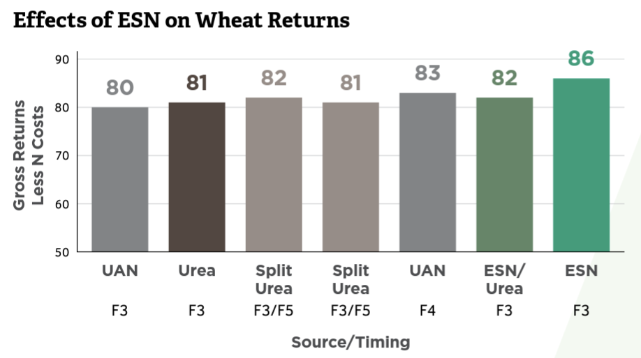 An Indiana study demonstrates how ESN can increase yields in wheat production. ESN protects nitrogen (N) from loss inside its unique protective coating and supplies N to the crop when it is needed. By supplying N to the crop later in the growing season, more N is available for protein production in the grain.