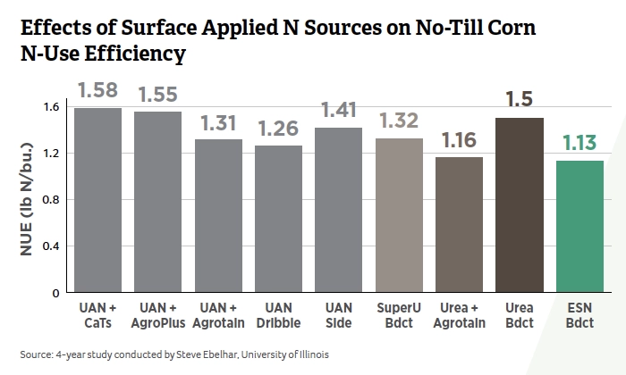 A four year Illinois study demonstrates how ESN can increase corn N Use Efficiency in conventional tillage, incorporated nitrogen systems. ESN protects nitrogen (N) from loss inside its unique protective coating and supplies N to the crop when it is needed. The result is increased corn yields and improved N-use efficiency.