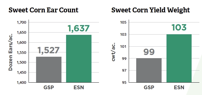 Average of six grower trials, Long Island, New York. Average N rate was 141 lbs N/ac for ESN and 139 lbs N/ac for grower’s standard practice (GSP). ESN was applied pre-plant; GSP was a split application of urea with 30 to 50% at planting and the remainder in one to two side-dress applications at about V4-V12.
