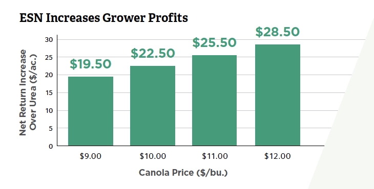 The graph below illustrates potential profit increases from using ESN instead of conventional urea for a range of canola prices. The profits shown are based on a conservative yield increase of three bu./ac., an ESN-urea price difference of $0.20/lb N, and a nitrogen application of 60 lb N/ac. as ESN blended with 30 lb N/ac. as urea. Typical yield increases observed in extensive field trials throughout western Canada are approximately 10%. Actual performance may vary with soil types, weather conditions and management practices. These profit estimates demonstrate ESN can be an important tool in increasing your canola yields and profits.