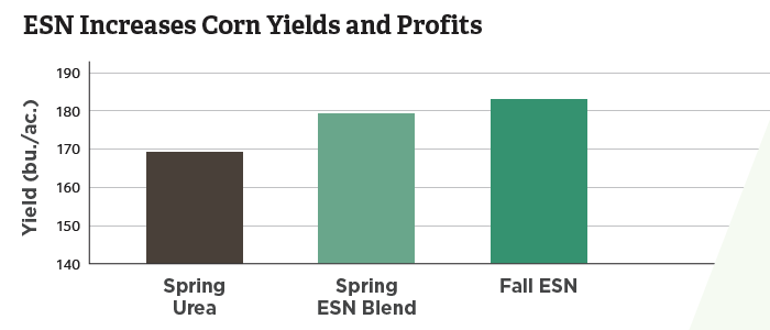 Field trials in Minnesota show the benefits of both fall and spring-applied ESN in corn. Fall and spring ESN applications out-yielded spring-applied urea in field trials during the growing season.