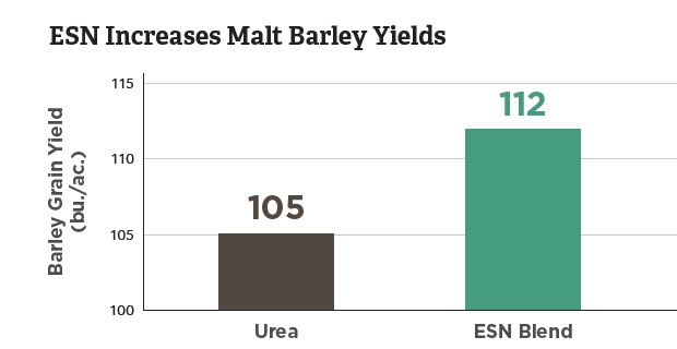 A trial in Idaho shows the value and flexibility of ESN Smart Nitrogen in malt barley production near Sun Valley. A 50:50 blend of ESN and urea out-yielded conventional urea applications. Figures below show yield gains observed in this farmer trial.