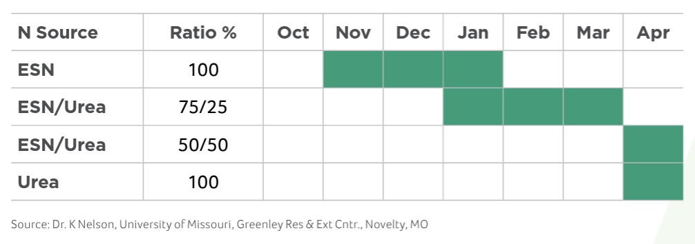 In a University of Missouri study, ESN and ESN blends consistently produced top wheat yields for all application times from October to April.
