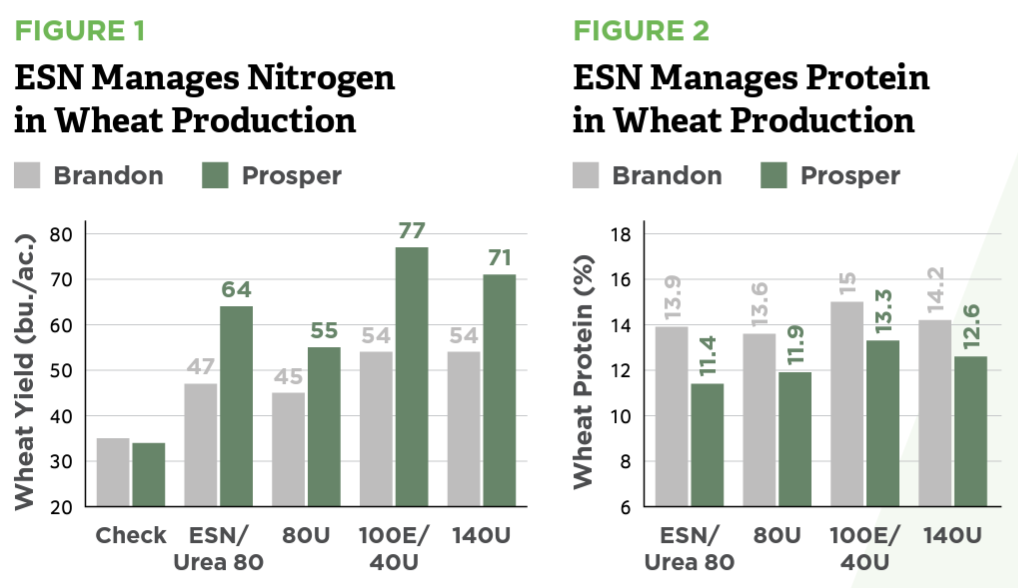 ESN blends can be used to provide protected N for high yielding wheat varieties, with reduced concern for in season N loss due to leaching, denitrification, or volatile loss potential that can occur through in season top-dress applications. Additionally, the controlled release feature of ESN provides both early season N for yield production, and later season N to build protein.