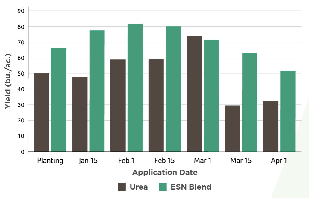 N/acre at various dates on soft red winter wheat. Results show that ESN produced yields greater than or equal to urea for all application dates. Additionally, while urea performance was highly dependent on application timing, ESN produced top yields over a much wider application window than urea. Rates of 50# per acre were also tested. Yields were lower, but the same basic differences between urea and ESN were observed.